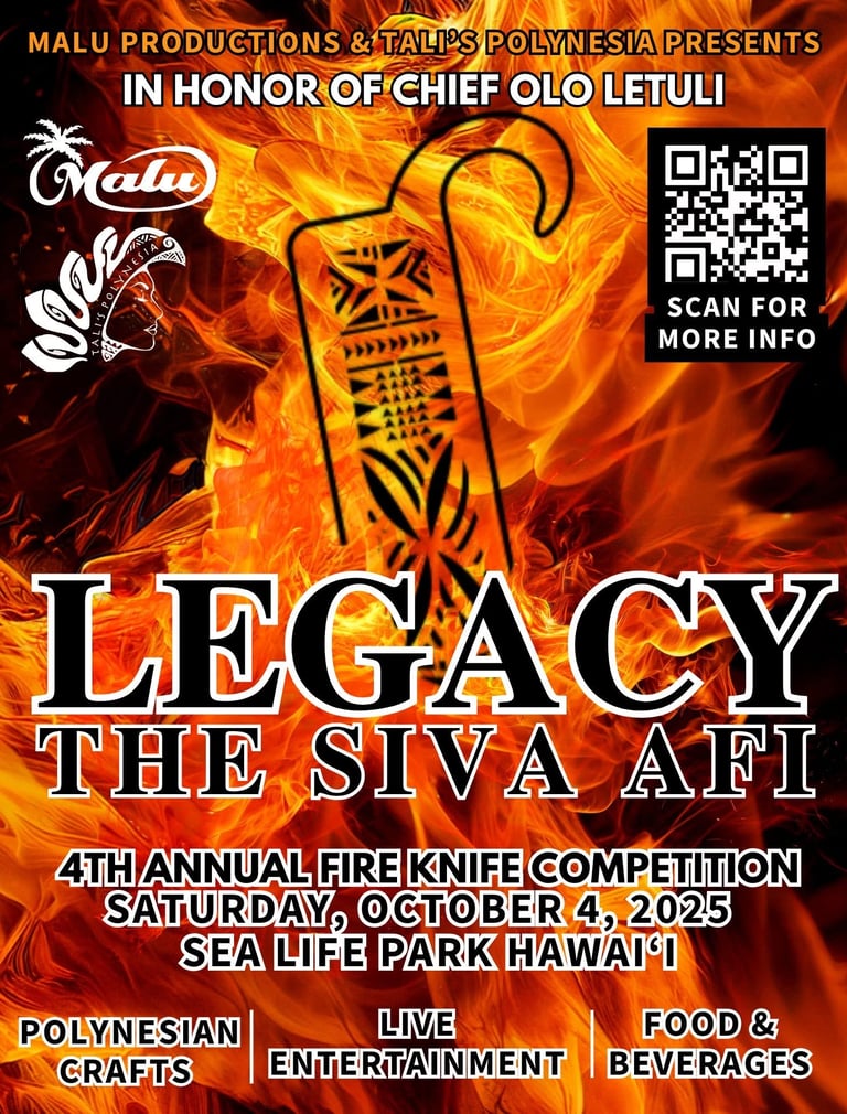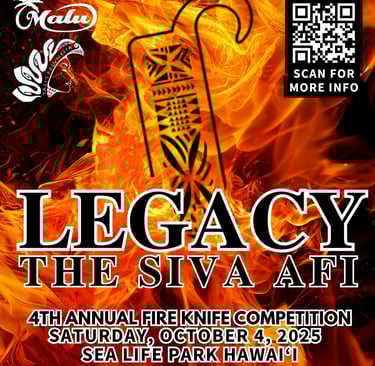 I thank Pulefano Galea'i and the people at the Polynesian Cultural Center in Laie, Hawaii for hosting the World Fire Knife Competition every year. I also thank Lene Leota and the Ailao Club from the Independent State of Samoa for hosting the annual Fire Knife Competition in Samoa. Finally, my heartfelt thanks to Flaming Sword of Samoa for bringing the World Fire Knife Competition home to American Samoa.